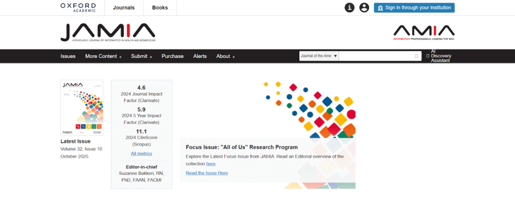 Journal of the American Medical Informatics Association (JAMIA) is the flagship peer-reviewed journal of the American Medical Informatics Association. It publishes original research on clinical informatics, data science, digital health systems, and applied AI in medicine.