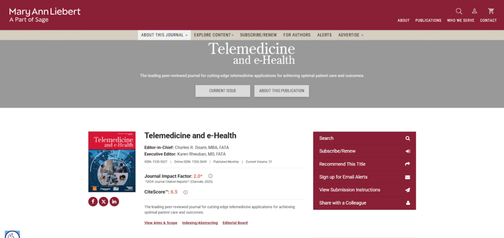 Telemedicine and e-Health is one of the longest-running, peer-reviewed journals focused on telemedicine, digital care delivery, and connected health systems. Published by Mary Ann Liebert, it is considered a flagship title in the field.