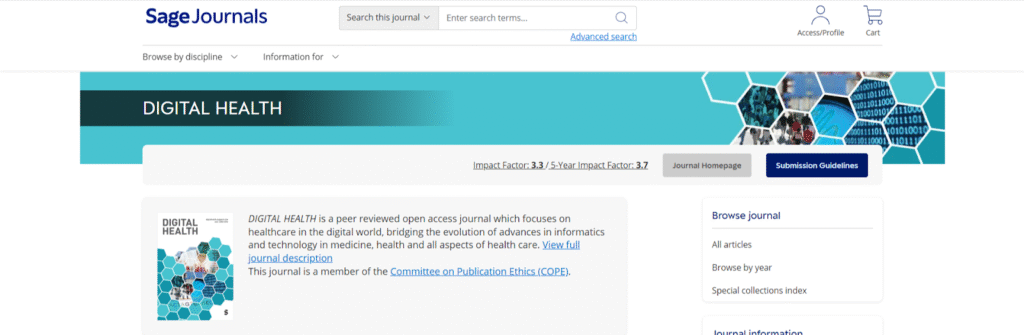 Sage Digital Health is an open-access, peer-reviewed journal covering digital technologies in healthcare, including telemedicine, digital therapeutics, data analytics, and connected devices. It has a 2025 impact factor of 3.3 and is indexed in Scopus and Web of Science.