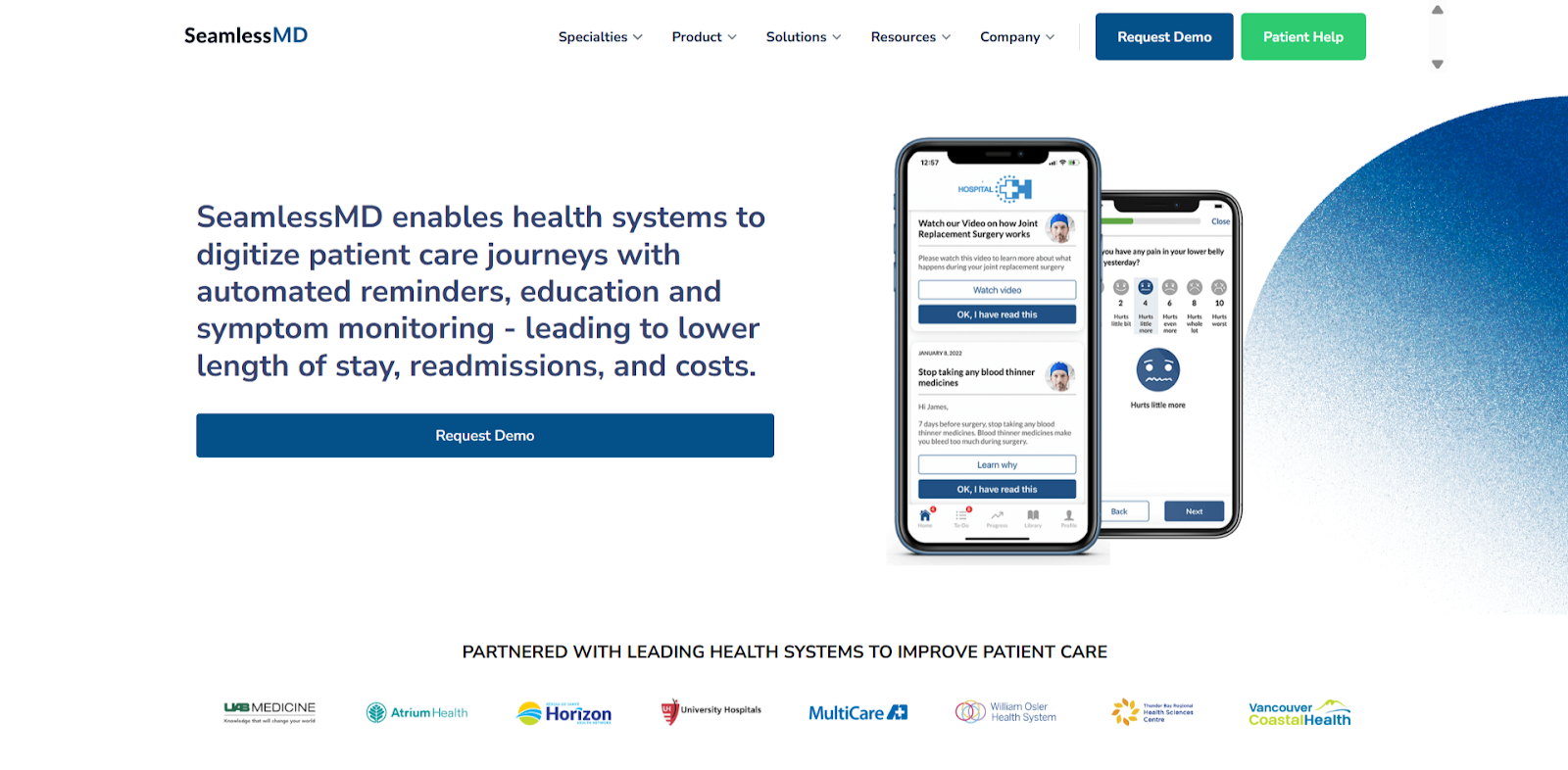 Clinical studies highlight significant results: Hoag Hospital reported a 15% shorter length of stay and 28% fewer readmissions, while Sault Area Hospital saw 72% fewer ER visits and 64% fewer readmissions in urology. With more than 35 evaluations and studies validating its impact, SeamlessMD is gaining recognition as a trusted partner for health systems adopting digital care pathways.