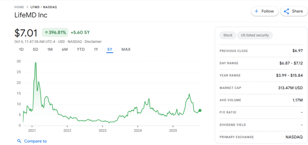 LifeMD shares have risen about 397% over the past five years, closing at $7.01 on October 6, 2025. The company’s market capitalization is $313.5 million, and the stock has traded between $3.99 and $15.84 over the past year.