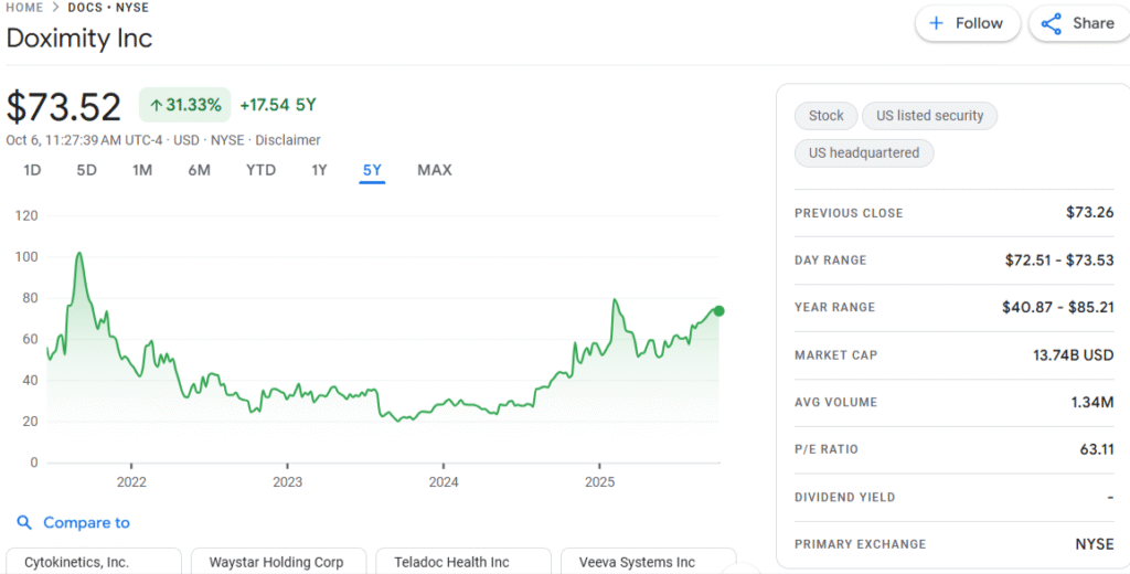 Doximity shares have increased about 31% over the past five years, closing at $73.52 on October 6, 2025. The company’s market capitalization is $13.7 billion, with a P/E ratio of 63.1. The stock has traded between $40.87 and $85.21 over the past year.