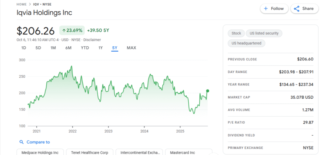 IQVIA shares have gained about 24% over the past five years, closing at $206.26 on October 6, 2025. The company’s market capitalization is $35.07 billion, with a P/E ratio of 29.9. The stock has traded between $134.65 and $237.34 over the past year.