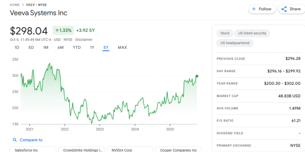 Veeva Systems shares have risen about 1% over the past five years, closing at $298.04 on October 6, 2025. The company’s market capitalization is $48.83 billion, with a P/E ratio of 61.2. Over the past year, the stock has traded between $200.30 and $302.00.