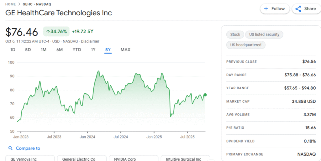 GE HealthCare shares have risen about 35% since their 2023 spin-off, closing at $76.46 on October 6, 2025. The company’s market capitalization is $34.85 billion, with a P/E ratio of 15.7 and a dividend yield of 0.18%. Over the past year, the stock has traded between $57.65 and $94.80.
