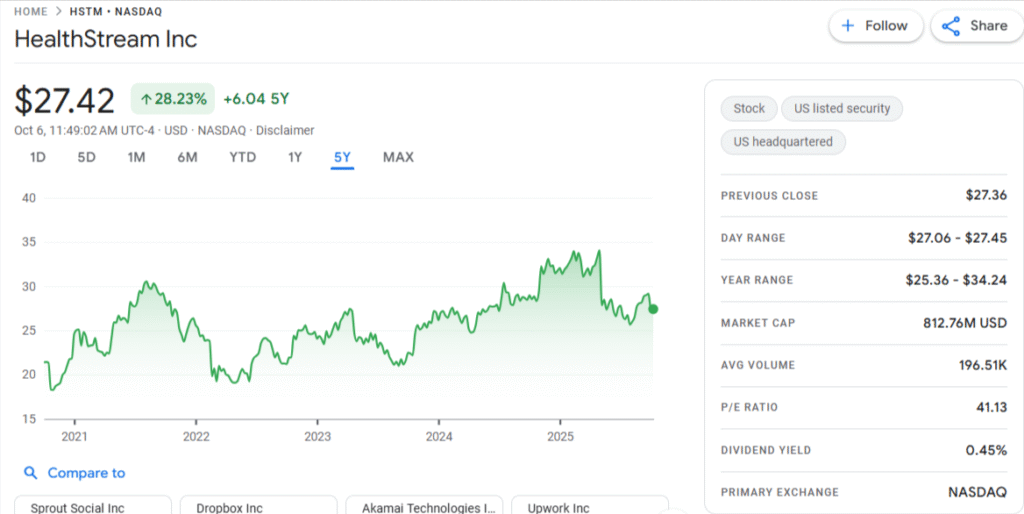 HealthStream shares have increased about 28% over the past five years, closing at $27.42 on October 6, 2025. The company’s market capitalization is $812.8 million, with a P/E ratio of 41.1 and a dividend yield of 0.45%. Over the past year, the stock has traded between $25.36 and $34.24.